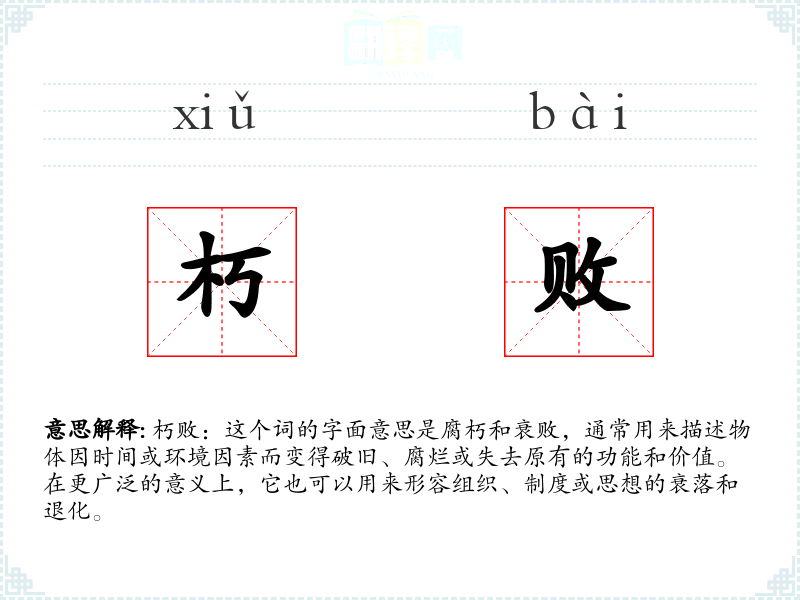 朽败:这个词的字面意思是腐朽和衰败,通常用来描述物体因时间或环境因素而变得破旧、腐烂或失去原有的功能和价值。在更广泛的意义上,它也可以用来形容组织、制度或思想的衰落和退化。