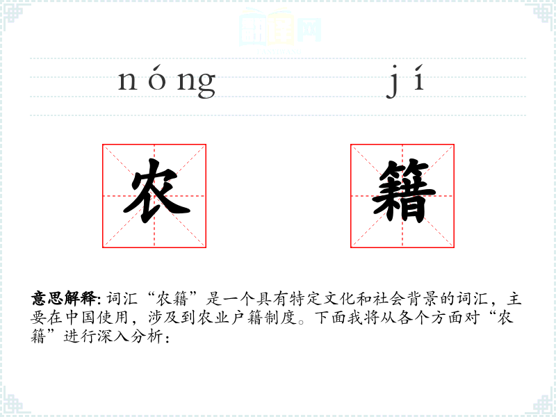 词汇“农籍”是一个具有特定文化和社会背景的词汇,主要在中国使用,涉及到农业户籍制度。下面我将从各个方面对“农籍”进行深入分析:
