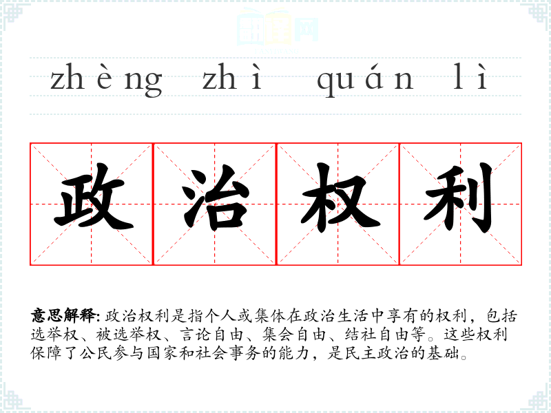 - 专业领域:在法学、政治学等领域,政治权利是核心概念,涉及宪法、人权法等。