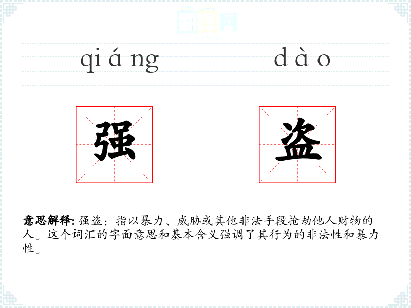 强盗:指以暴力、威胁或其他非法手段抢劫他人财物的人。这个词汇的字面意思和基本含义强调了其行为的非法性和暴力性。