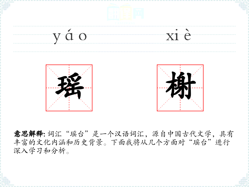 词汇“瑶台”是一个汉语词汇,源自*古代文学,具有丰富的文化内涵和历史背景。下面我将从几个方面对“瑶台”进行深入学和分析。