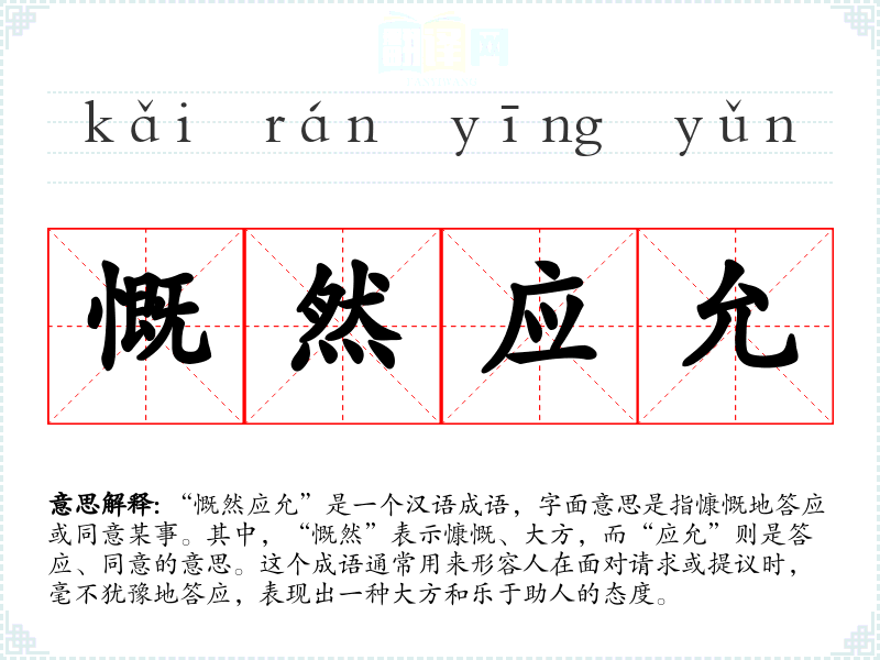 “慨然应允”是一个汉语成语,字面意思是指慷慨地答应或同意某事。其中,“慨然”表示慷慨、大方,而“应允”则是答应、同意的意思。这个成语通常用来形容人在面对请求或提议时,毫不犹豫地答应,表现出一种大方和乐于助人的态度。