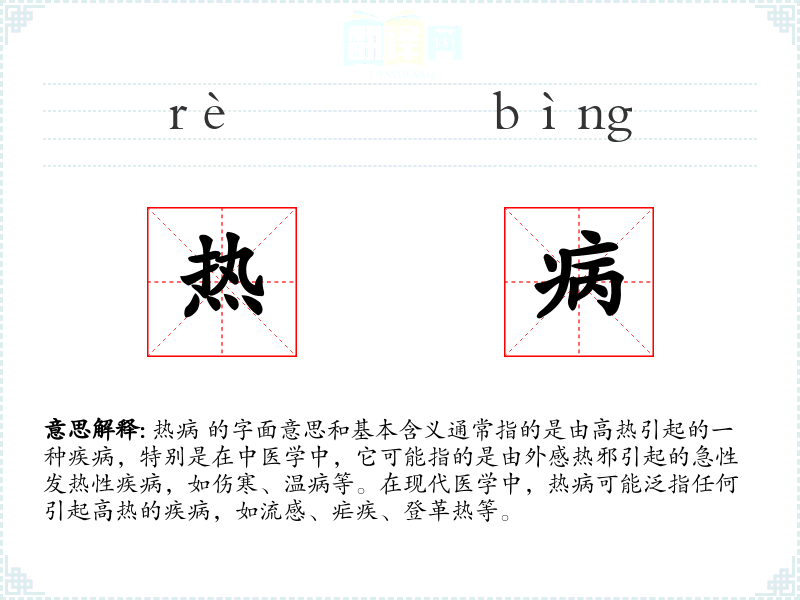 热病 的字面意思和基本含义通常指的是由高热引起的一种疾病,特别是在中医学中,它可能指的是由外感热邪引起的急性发热性疾病,如伤寒、温病等。在现代医学中,热病可能泛指任何引起高热的疾病,如流感、疟疾、登革热等。