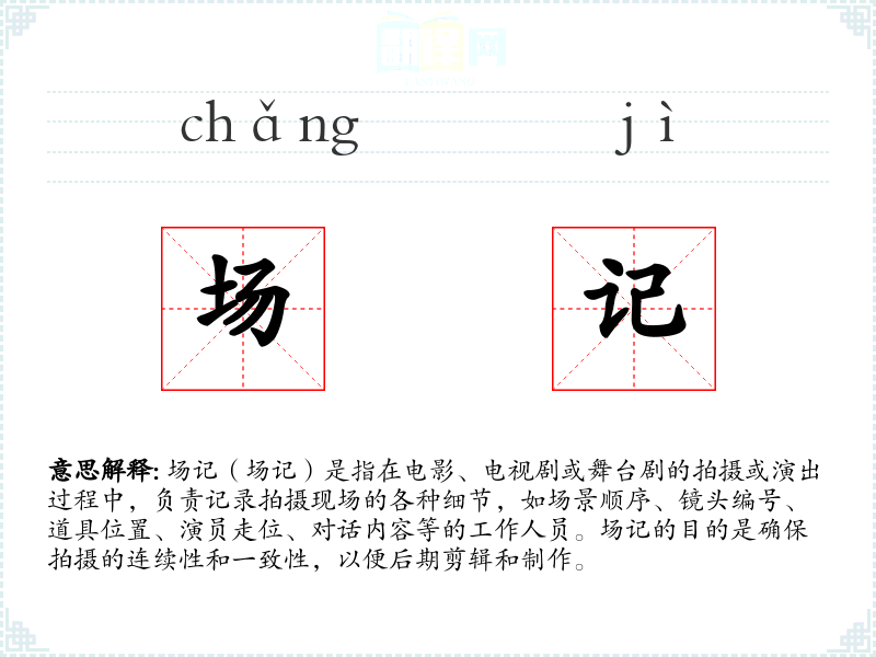 场记这个词汇在影视制作中具有重要的意义,它不仅代表了记录和细节管理的工作,也体现了幕后工作人员的专业性和重要性。在学*语言和表达中,理解和运用这样的专业词汇可以增强沟通的准确性和专业性。