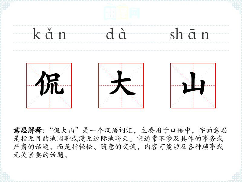 “侃大山”是一个汉语词汇,主要用于口语中,字面意思是指无目的地闲聊或漫无边际地聊天。它通常不涉及具体的事务或严肃的话题,而是指轻松、随意的交谈,内容可能涉及各种琐事或无关紧要的话题。