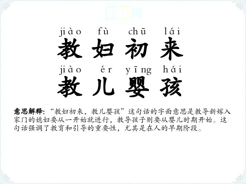 “教妇初来,教儿婴孩”这句话的字面意思是教导新嫁入家门的媳妇要从一开始就进行,教导孩子则要从婴儿时期开始。这句话强调了教育和引导的重要性,尤其是在人的早期阶段。