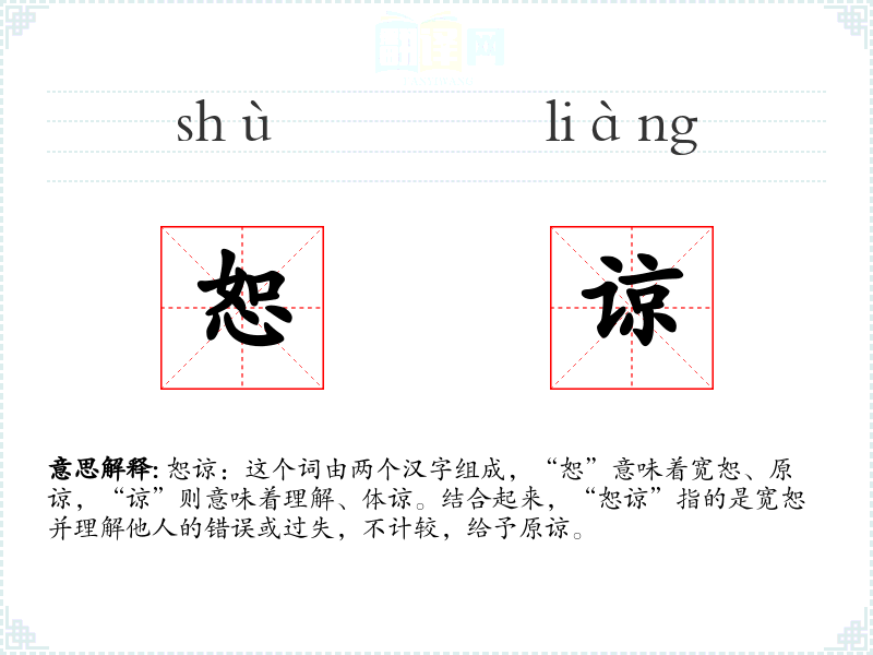 恕谅:这个词由两个汉字组成,“恕”意味着宽恕、原谅,“谅”则意味着理解、体谅。结合起来,“恕谅”指的是宽恕并理解他人的错误或过失,不计较,给予原谅。