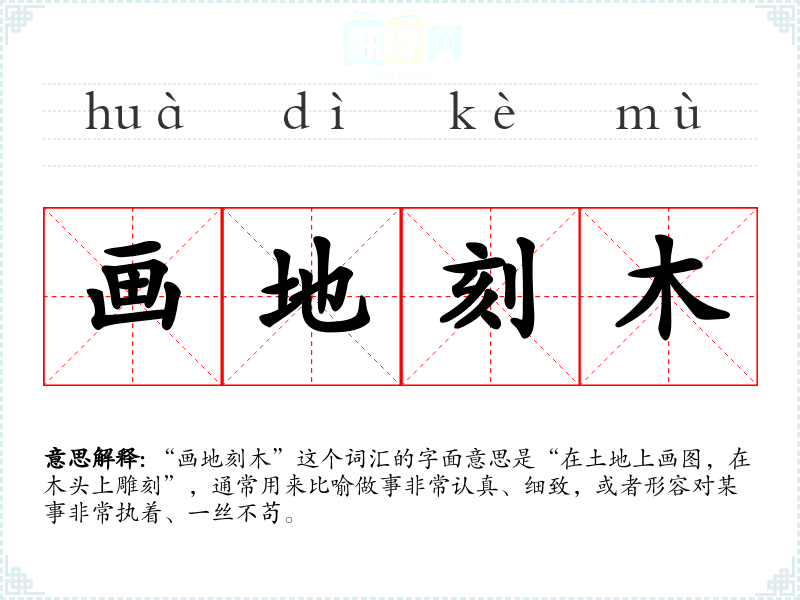 “画地刻木”这个词汇的字面意思是“在土地上画图,在木头上雕刻”,通常用来比喻做事非常认真、细致,或者形容对某事非常执着、一丝不苟。