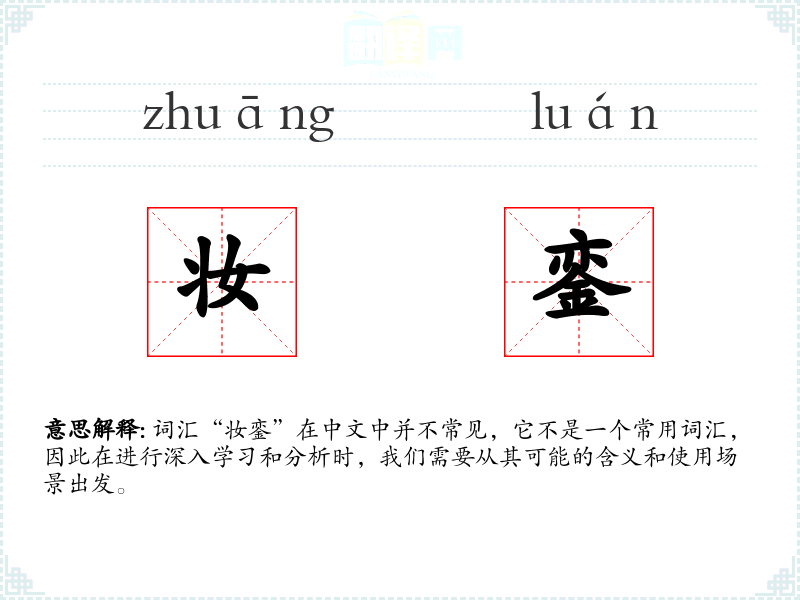 词汇“妆銮”在中文中并不常见,它不是一个常用词汇,因此在进行深入学*和分析时,我们需要从其可能的含义和使用场景出发。