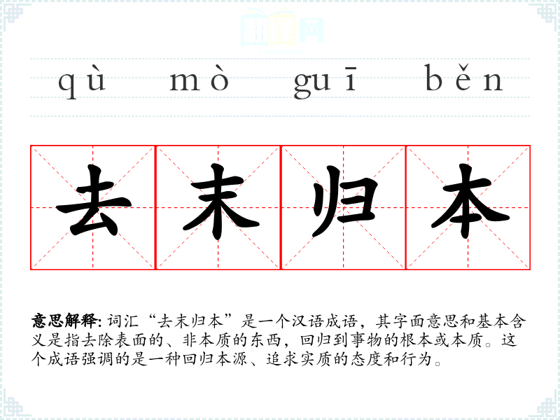 词汇“去末归本”是一个汉语成语,其字面意思和基本含义是指去除表面的、非本质的东西,回归到事物的根本或本质。这个成语强调的是一种回归本源、追求实质的态度和行为。