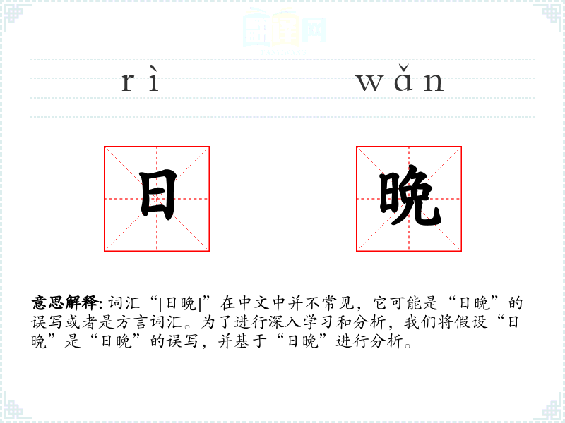 词汇“[日晩]”在中文中并不常见,它可能是“日晚”的误写或者是方言词汇。为了进行深入学*和分析,我们将假设“日晩”是“日晚”的误写,并基于“日晚”进行分析。