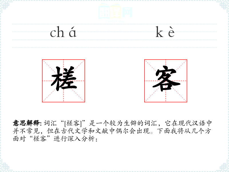词汇“[槎客]”是一个较为生僻的词汇,它在现代汉语中并不常见,但在古代文学和文献中偶尔会出现。下面我将从几个方面对“槎客”进行深入分析:
