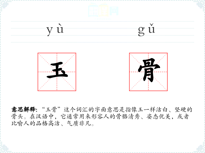 - 反义词:粗骨、陋骨(这些反义词并不常用,因为“玉骨”本身带有很强的正面意义)