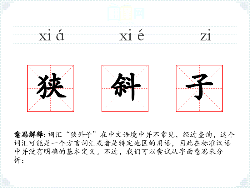 词汇“狭斜子”在中文语境中并不常见,经过查询,这个词汇可能是一个方言词汇或者是特定地区的用语,因此在标准汉语中并没有明确的基本定义。不过,我们可以尝试从字面意思来分析: