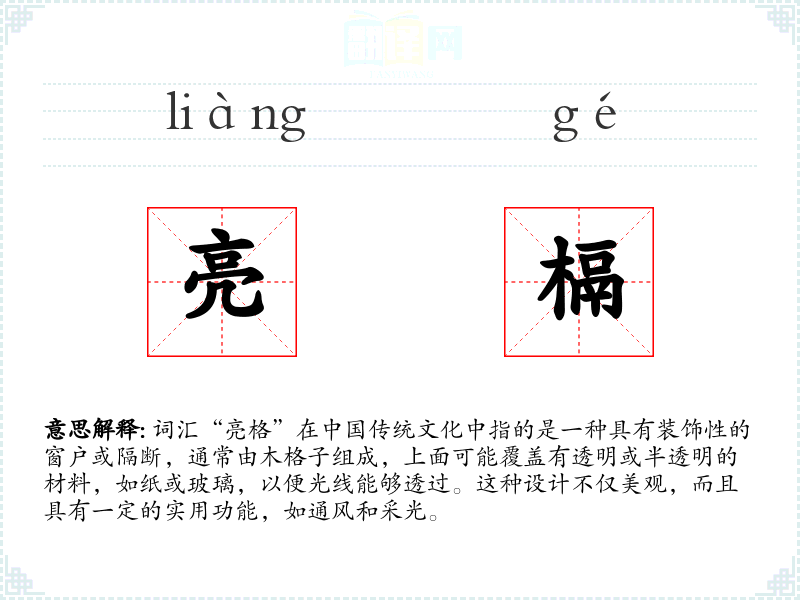 词汇“亮格”在**传统文化中指的是一种具有装饰性的窗户或隔断,通常由木格子组成,上面可能覆盖有透明或半透明的材料,如纸或玻璃,以便光线能够透过。这种设计不仅美观,而且具有一定的实用功能,如通风和采光。