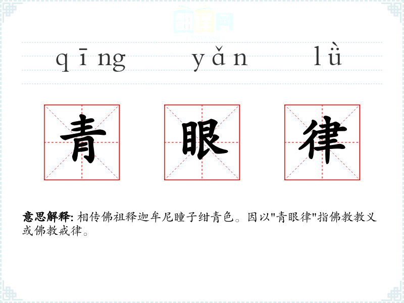 相传佛祖释迦牟尼瞳子绀青色。因以"青眼律"指佛教教义或佛教戒律。