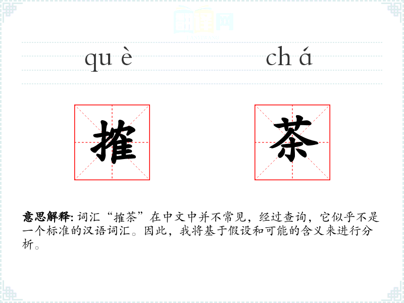词汇“搉茶”在中文中并不常见,经过查询,它似乎不是一个标准的汉语词汇。因此,我将基于假设和可能的含义来进行分析。