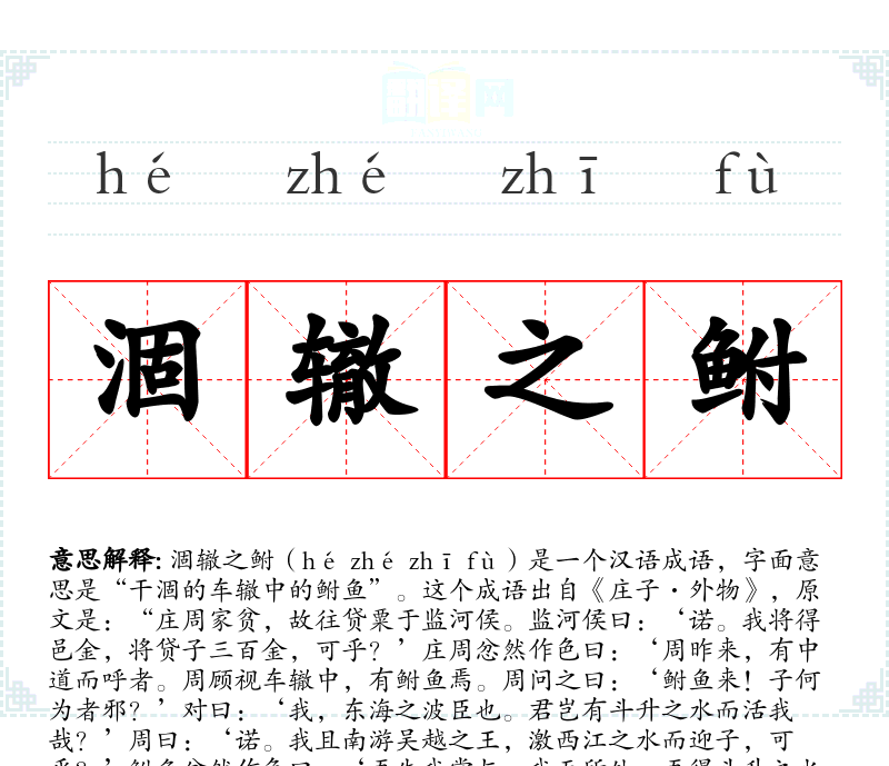 涸辙之鲋(hé zhé zhī fù)是一个汉语成语,字面意思是“干涸的车辙中的鲋鱼”。这个成语出自《庄子·外物》,原文是:“庄周家贫,故往贷粟于监河侯。监河侯曰:‘诺。我将得邑金,将贷子三百金,可乎?’庄周忿然作色曰:‘周昨来,有中道而呼者。周顾视车辙中,有鲋鱼焉。周问之曰:‘鲋鱼来!子何为者邪?’对曰:‘我,东海之波臣也。君岂有斗升之水而活我哉?’周曰:‘诺。我且南游吴越之王,激西江之水而迎子,可乎?’鲋鱼忿然作色曰:‘吾失我常与,我无所处。吾得斗升之水然活耳,君乃言此,曾不如早索我于枯鱼之肆!’”