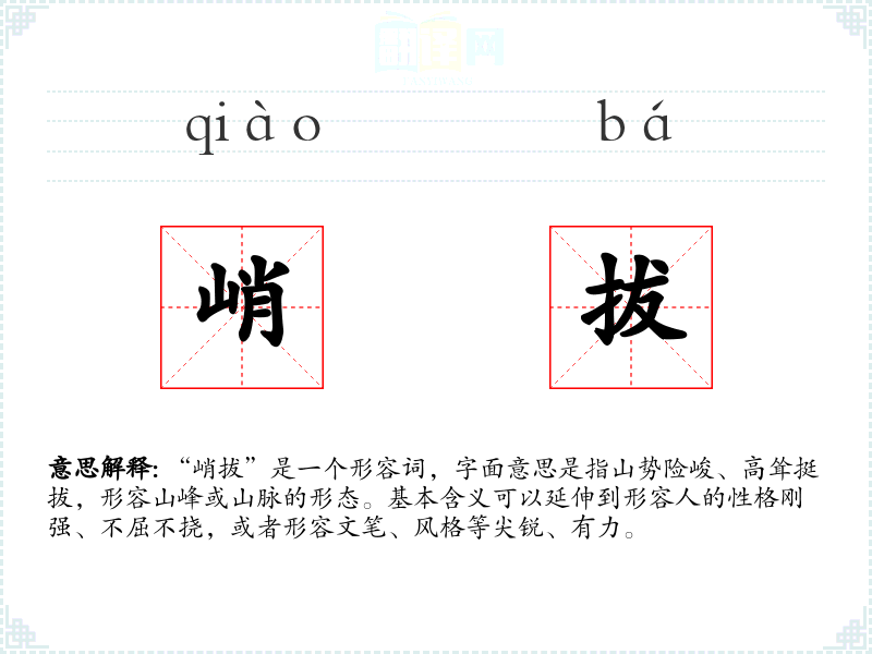“峭拔”是一个形容词,字面意思是指山势险峻、高耸挺拔,形容山峰或山脉的形态。基本含义可以延伸到形容人的性格刚强、不屈不挠,或者形容文笔、风格等尖锐、有力。