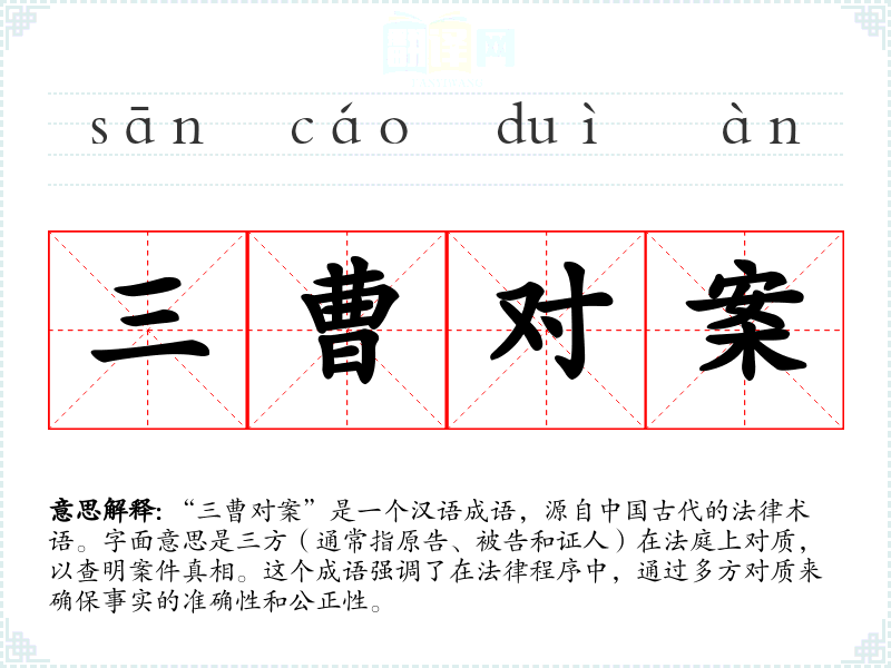 “三曹对案”是一个汉语成语,源自**古代的法律术语。字面意思是三方(通常指原告、被告和证人)在法庭上对质,以查明案件真相。这个成语强调了在法律程序中,通过多方对质来确保事实的准确性和公正性。