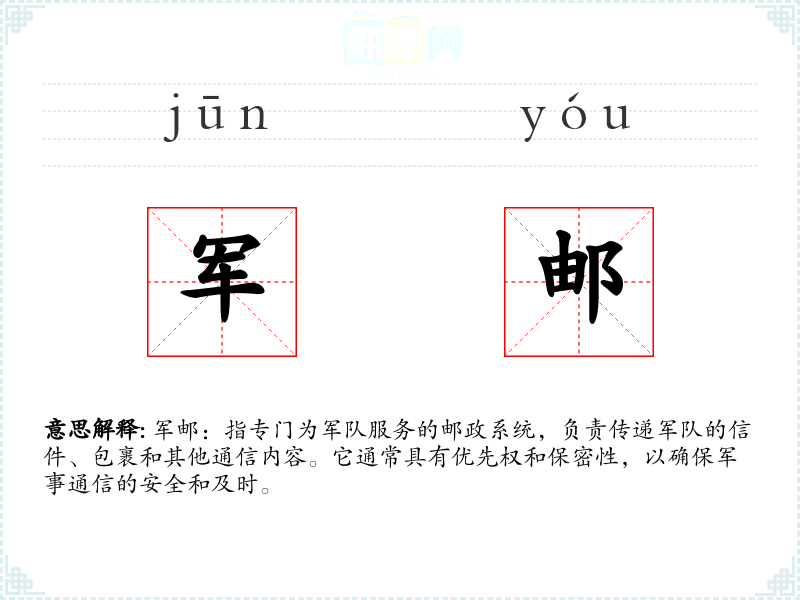 军邮:指专门为军队服务的邮政系统,负责传递军队的信件、包裹和其他通信内容。它通常具有优先权和保密性,以确保军事通信的安全和及时。