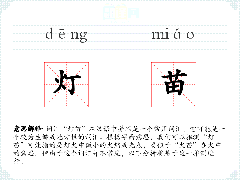“灯苗”字面意思是指灯火中的微小火焰或光点,可能用来形容灯光微弱或初燃的状态。