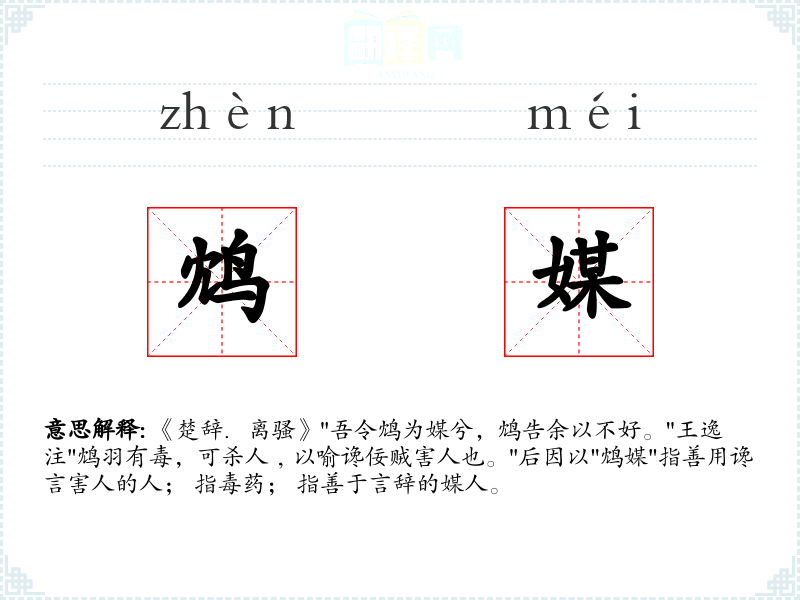 《楚辞.离骚》"吾令鸩为媒兮,鸩告余以不好。"王逸注"鸩羽有毒,可杀人﹐以喻谗佞贼害人也。"后因以"鸩媒"指善用谗言害人的人; 指毒药; 指善于言辞的媒人。