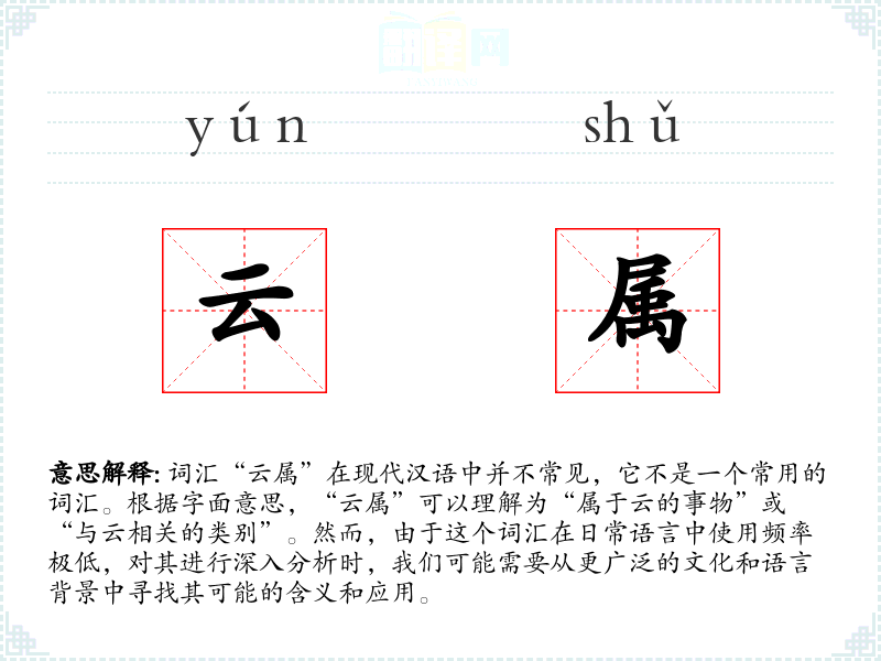 由于“云属”不是一个常用词汇,其词源和历史演变的信息较少。在古代汉语中,可能会有类似的表达,用以描述与云相关的特性或状态。