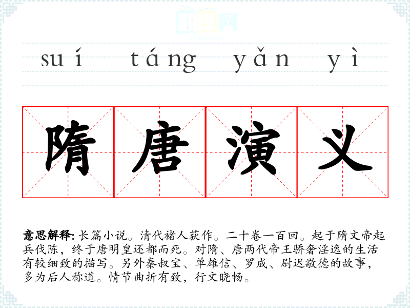 1.长篇小说。清代褚人获作。二十卷一百回。起于隋文帝起兵伐陈,终于唐明皇还都而死。对隋、唐两代帝王骄奢淫逸的生活有较细致的描写。另外秦叔宝、单雄信、罗成、尉迟敬德的故事,多为后人称道。情节曲折有致,行文晓畅。