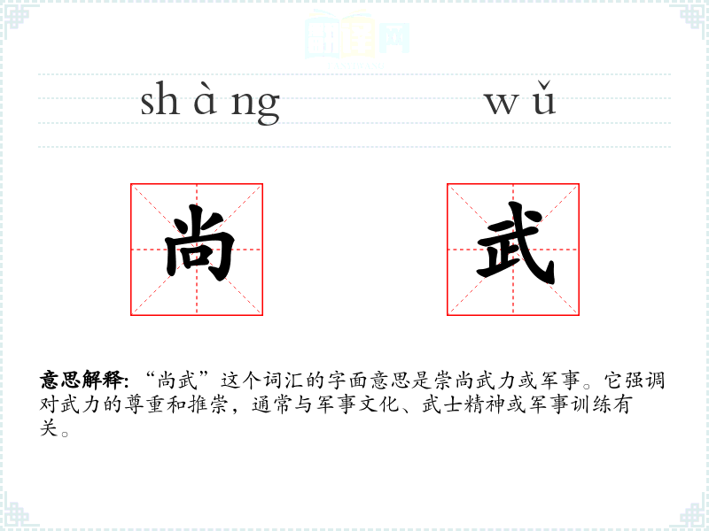 “尚武”这个词汇的字面意思是崇尚武力或军事。它强调对武力的尊重和推崇,通常与军事文化、武士精神或军事训练有关。