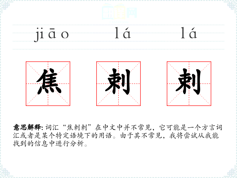 “焦剌剌”可能指的是一种感觉或状态,具体含义可能与“焦急”、“刺痛”或“刺激”有关。由于缺乏广泛的文献支持,这个词汇的具体定义可能需要依赖于特定的方言或语境。