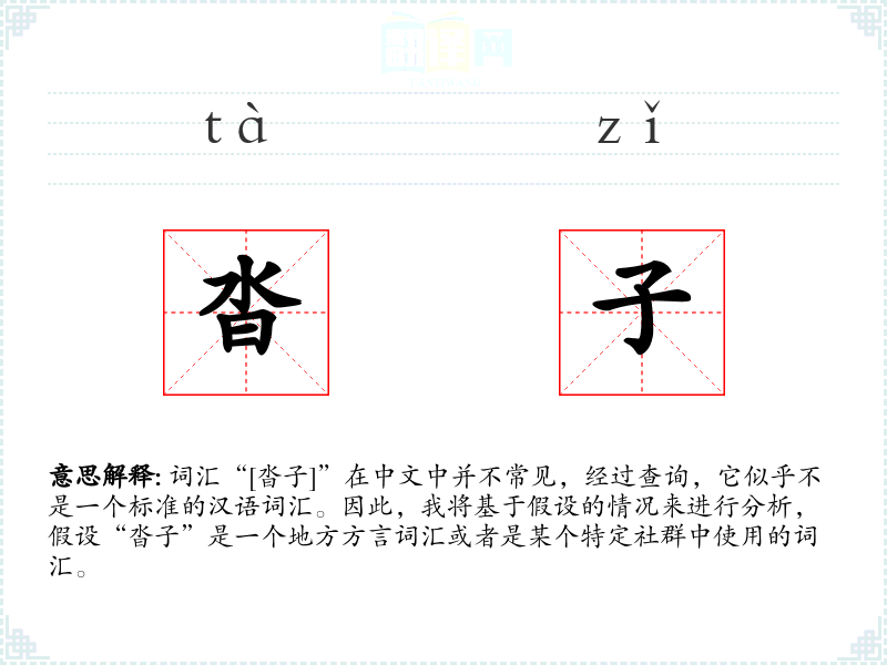 词汇“[沓子]”在中文中并不常见,经过查询,它似乎不是一个标准的汉语词汇。因此,我将基于假设的情况来进行分析,假设“沓子”是一个地方方言词汇或者是某个特定社群中使用的词汇。