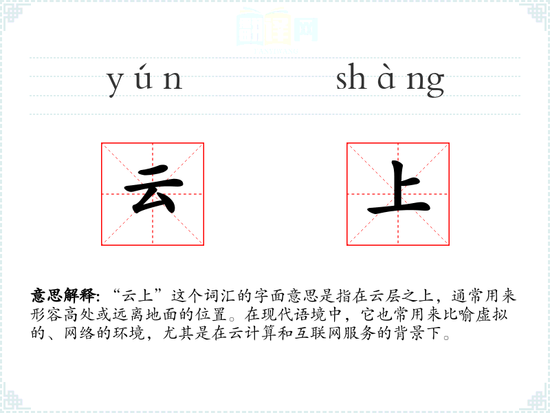 “云上”这个词汇在现代语境中具有丰富的含义和应用,它不仅描述了物理空间的高处,也象征着虚拟世界的便捷和先进。在语言学习和表达中,理解和灵活运用这个词汇,能够丰富我们的表达方式,并更好地适应数字化时代的需求。