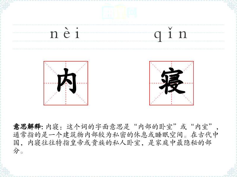 在现代生活中,内寝这个词可能不太常用,但在描述传统建筑或历史故事时,它仍然是一个有用的词汇。