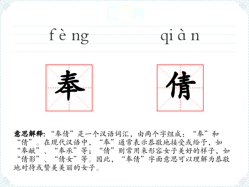 “奉倩”是一个汉语词汇,由两个字组成:“奉”和“倩”。在现代汉语中,“奉”通常表示恭敬地接受或给予,如“奉献”、“奉承”等;“倩”则常用来形容女子美好的样子,如“倩影”、“倩女”等。因此,“奉倩”字面意思可以理解为恭敬地对待或赞美美丽的女子。