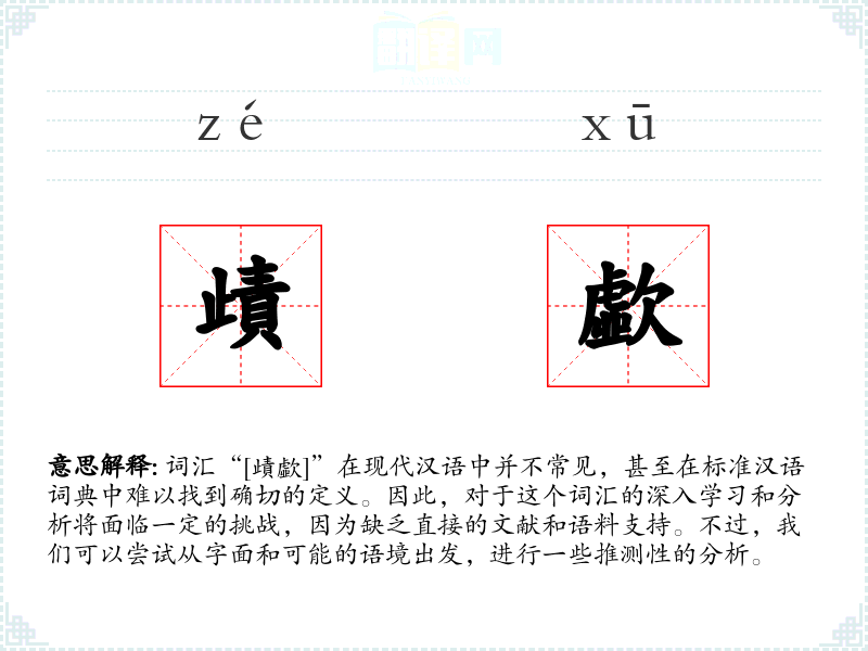 词汇“[歵歔]”在现代汉语中并不常见,甚至在标准汉语词典中难以找到确切的定义。因此,对于这个词汇的深入学习和分析将面临一定的挑战,因为缺乏直接的文献和语料支持。不过,我们可以尝试从字面和可能的语境出发,进行一些推测性的分析。