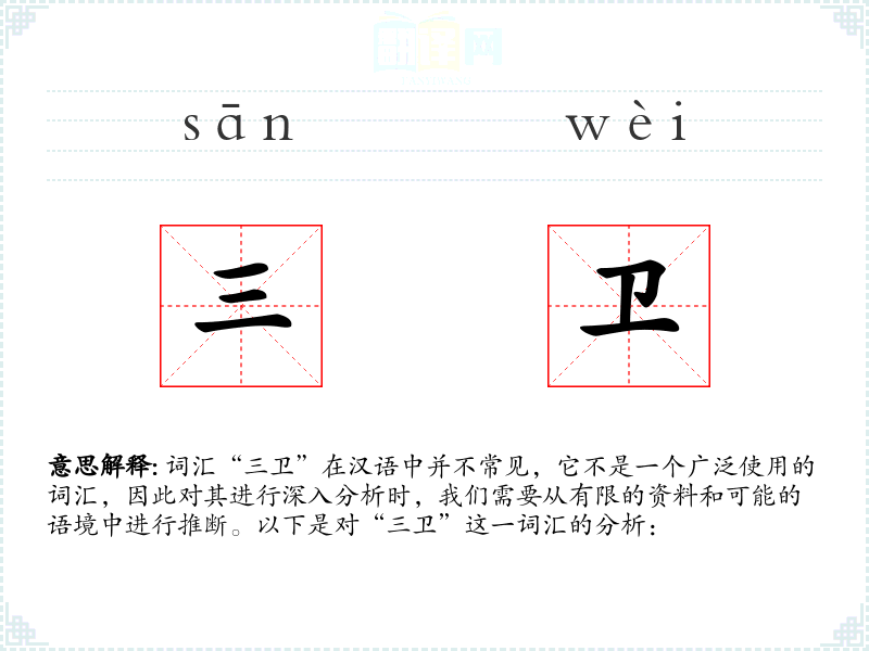 - 反义词:无(由于“三卫”不是一个常用词汇,很难找到直接的反义词)