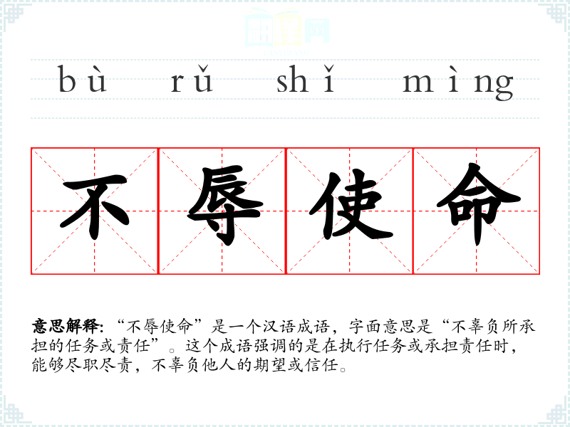 “不辱使命”是一个汉语成语,字面意思是“不辜负所承担的任务或责任”。这个成语强调的是在执行任务或承担责任时,能够尽职尽责,不辜负他人的期望或信任。