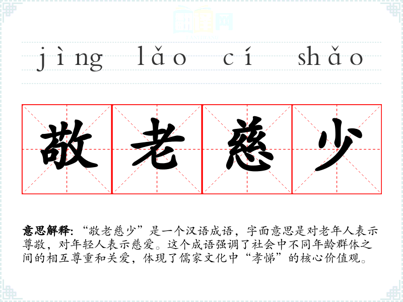 “敬老慈少”是一个汉语成语,字面意思是对老年人表示尊敬,对年轻人表示慈爱。这个成语强调了社会中不同年龄群体之间的相互尊重和关爱,体现了儒家文化中“孝悌”的核心价值观。