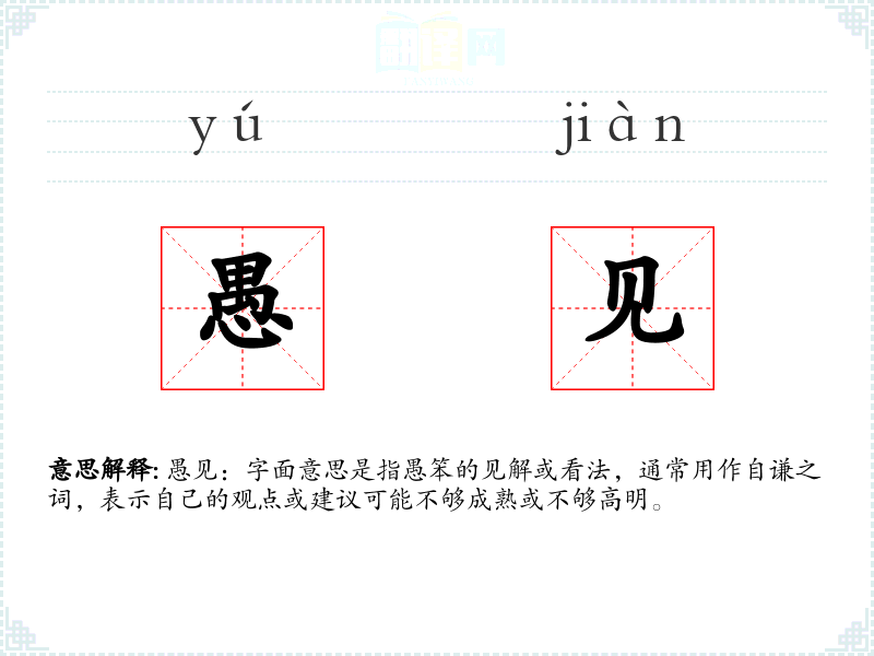 愚见:字面意思是指愚笨的见解或看法,通常用作自谦之词,表示自己的观点或建议可能不够成熟或不够高明。
