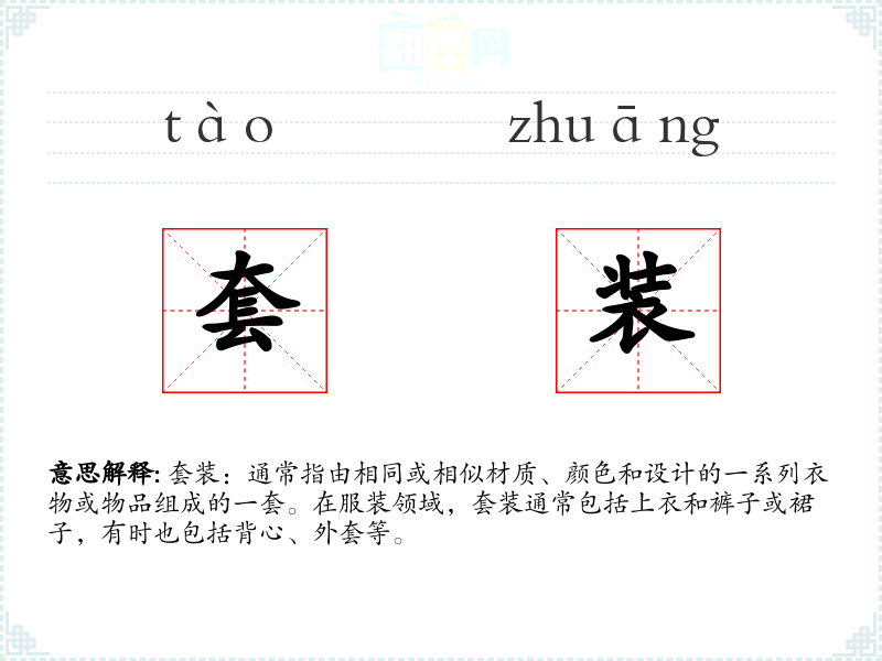 "套装"的意思解释、套装是什么意思由翻译网汉语词典查词提供。