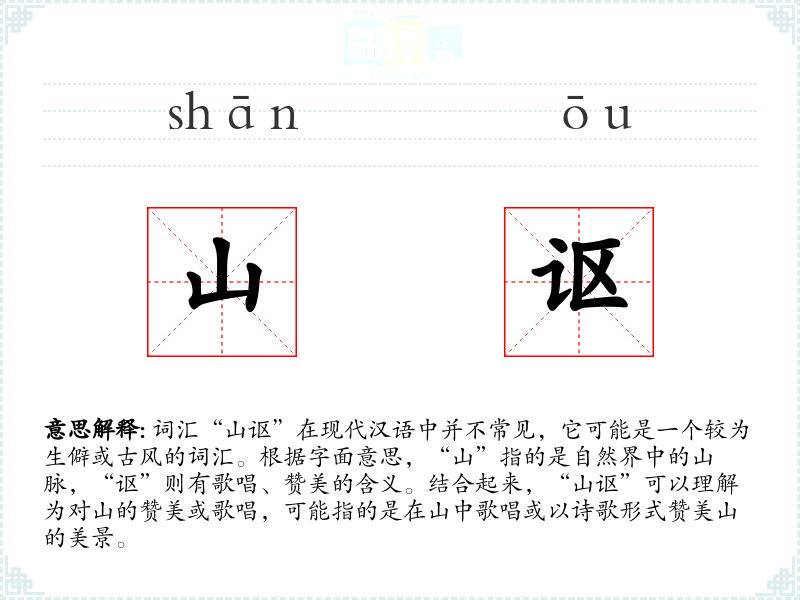 词汇“山讴”在现代汉语中并不常见,它可能是一个较为生僻或古风的词汇。根据字面意思,“山”指的是自然界中的山脉,“讴”则有歌唱、赞美的含义。结合起来,“山讴”可以理解为对山的赞美或歌唱,可能指的是在山中歌唱或以诗歌形式赞美山的美景。