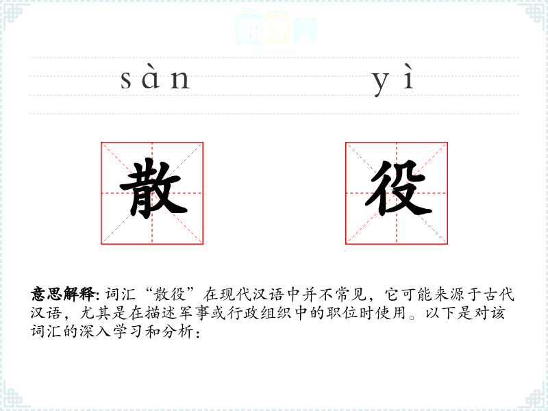 词汇“散役”在现代汉语中并不常见,它可能来源于古代汉语,尤其是在描述军事或行政组织中的职位时使用。以下是对该词汇的深入学*和分析: