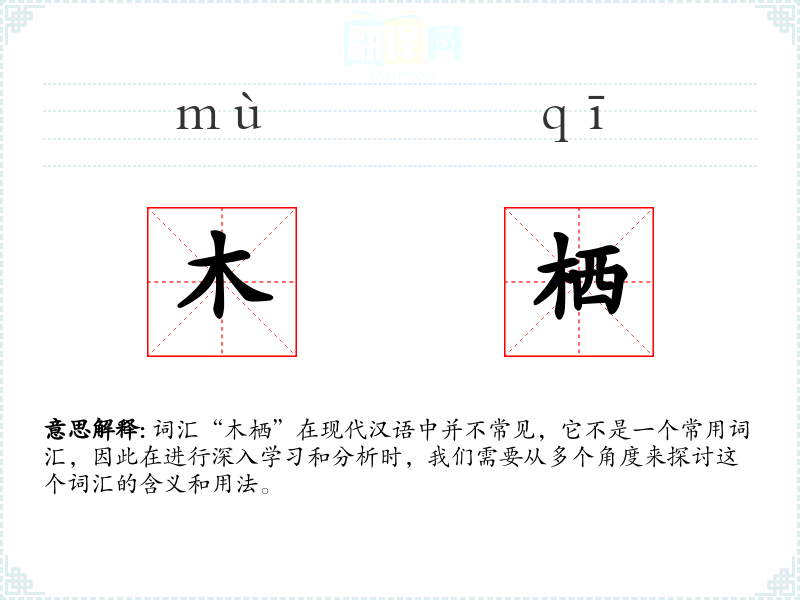 词汇“木栖”在现代汉语中并不常见,它不是一个常用词汇,因此在进行深入学*和分析时,我们需要从多个角度来探讨这个词汇的含义和用法。