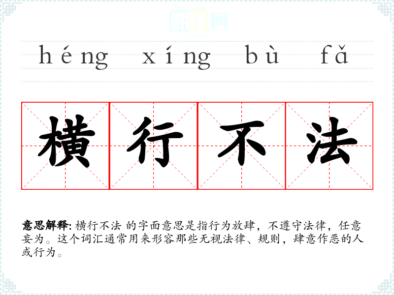 横行不法 的字面意思是指行为放肆,不遵守法律,任意妄为。这个词汇通常用来形容那些无视法律、规则,肆意作恶的人或行为。