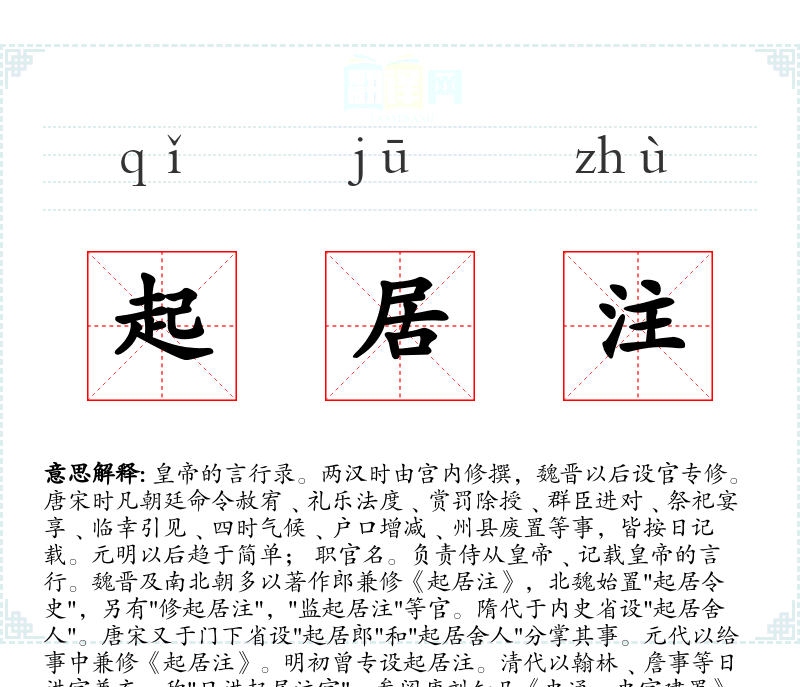 皇帝的言行录。两汉时由宫内修撰,魏晋以后设官专修。唐宋时凡朝廷命令赦宥﹑礼乐法度﹑赏罚除授﹑群臣进对﹑祭祀宴享﹑临幸引见﹑四时气候﹑户口增减﹑州县废置等事,皆按日记载。元明以后趋于简单; 职官名。负责侍从皇帝﹑记载皇帝的言行。魏晋及南北朝多以著作郎兼修《起居注》,北魏始置"起居令史",另有"修起居注","监起居注"等官。隋代于内史省设"起居舍人"。唐宋又于门下省设"起居郎"和"起居舍人"分掌其事。元代以给事中兼修《起居注》。明初曾专设起居注。清代以翰林﹑詹事等日讲官兼充,称"日讲起居注官"。参阅唐刘知几《史通.史官建置》﹑《通典.职官三》﹑《续通典.职官》。