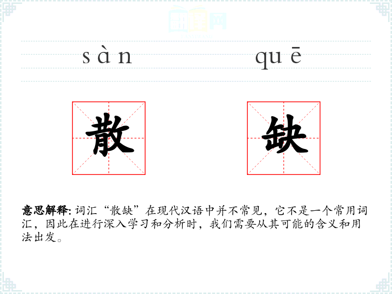 词汇“散缺”在现代汉语中并不常见,它不是一个常用词汇,因此在进行深入学习和分析时,我们需要从其可能的含义和用法出发。