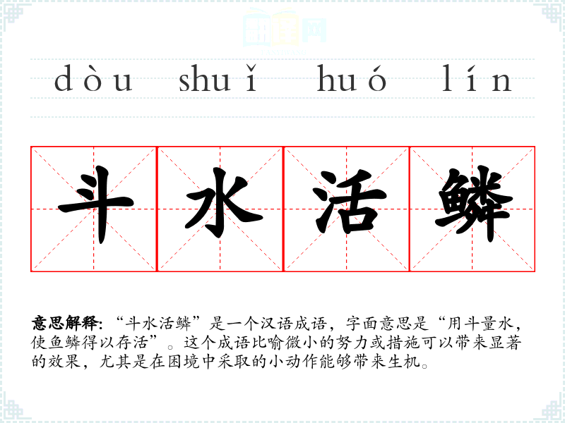 “斗水活鳞”是一个汉语成语,字面意思是“用斗量水,使鱼鳞得以存活”。这个成语比喻微小的努力或措施可以带来显著的效果,尤其是在困境中采取的小动作能够带来生机。