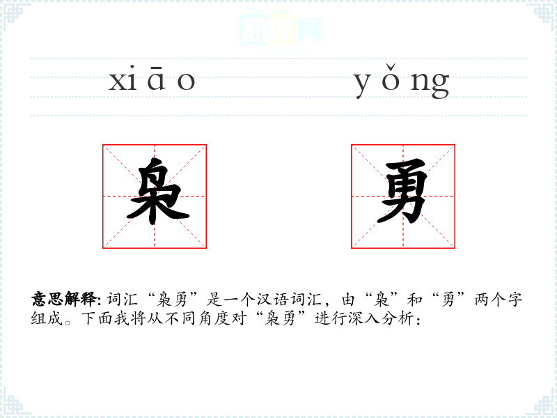 “枭”字最初指的是一种猛禽,后来引申为凶猛、勇猛的意思。“勇”字则一直指勇敢、有胆量。两个字结合成“枭勇”,强调了勇敢和凶猛的特质。
