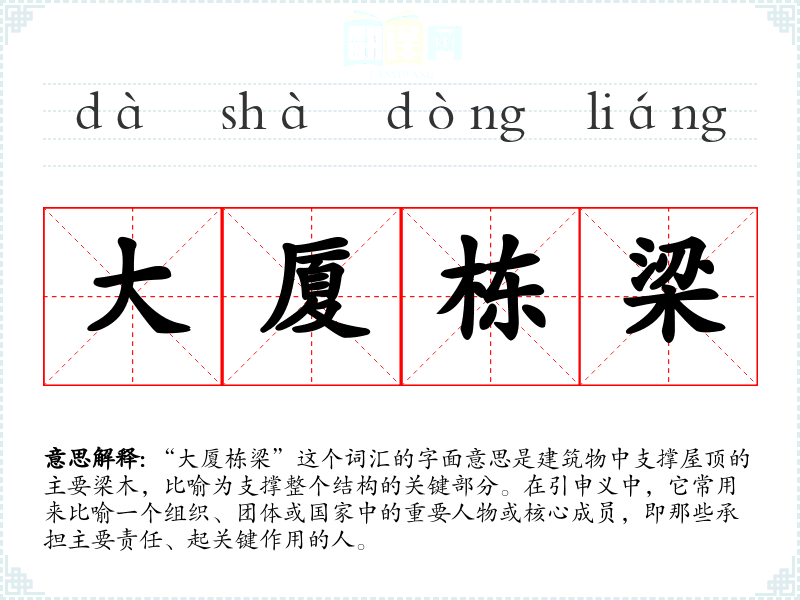 “大厦栋梁”这个词汇的字面意思是建筑物中支撑屋顶的主要梁木,比喻为支撑整个结构的关键部分。在引申义中,它常用来比喻一个组织、团体或国家中的重要人物或核心成员,即那些承担主要责任、起关键作用的人。